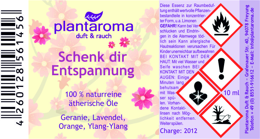 | Zutaten: | Geranie, Lavendel, Orange, Ylang-Ylang |